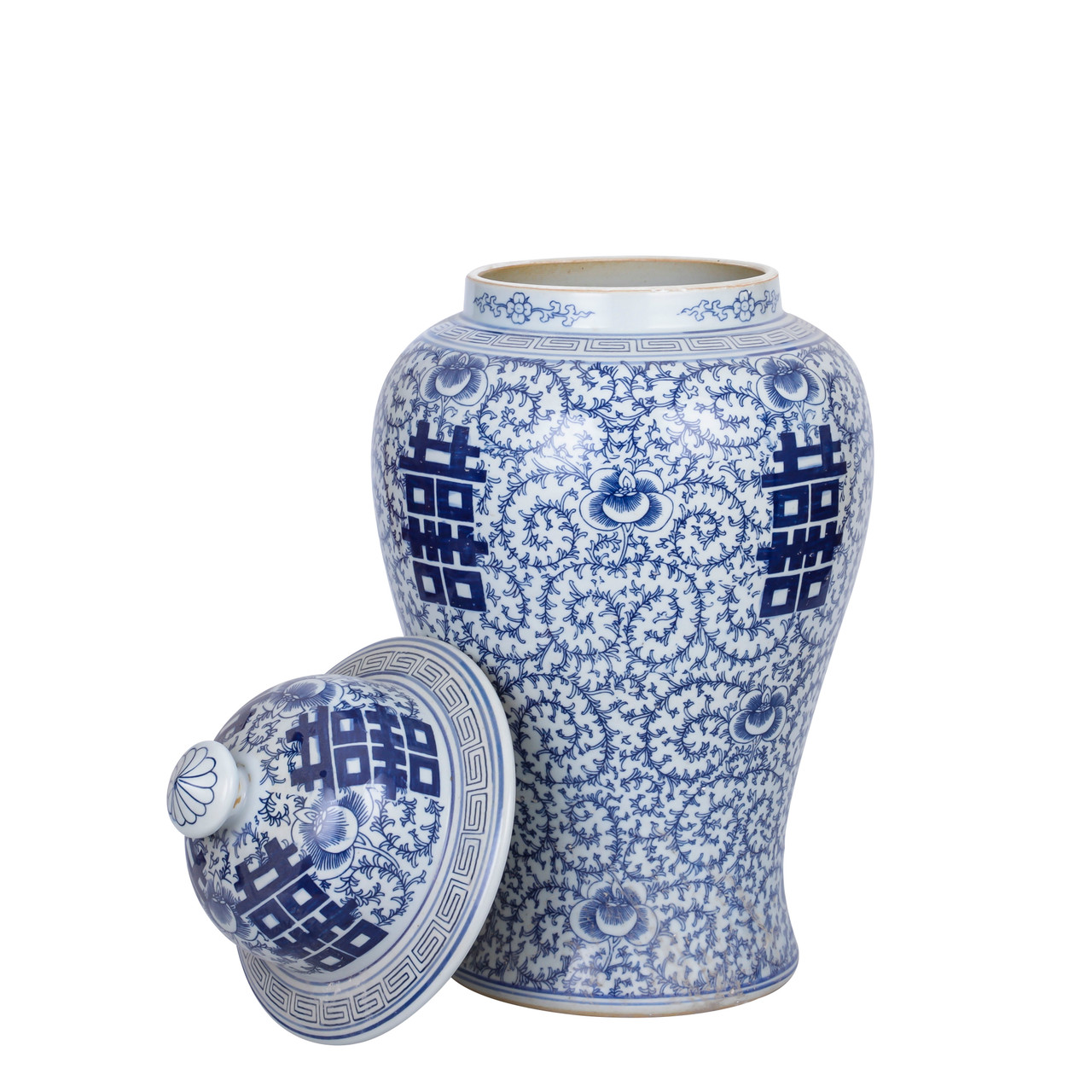 Blue And White Porcelain Double Happiness Floral Temple Jar – 2 Sizes