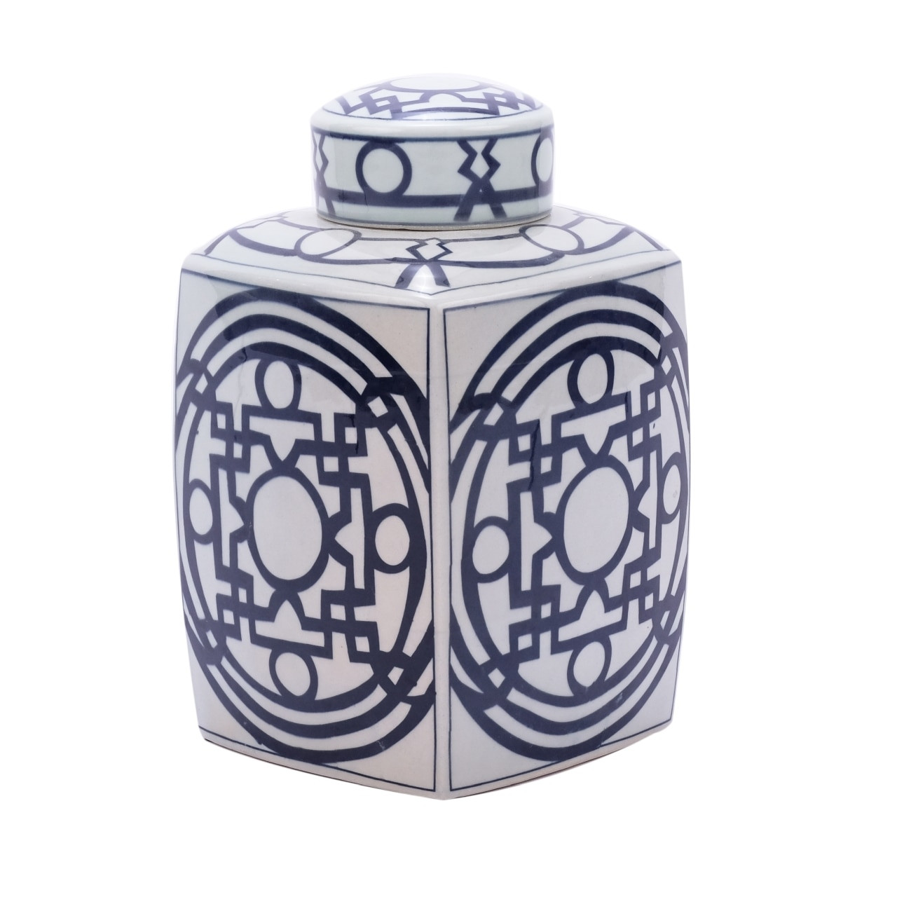 Blue & White Square Tea Jar With Pattern of Lines – Large