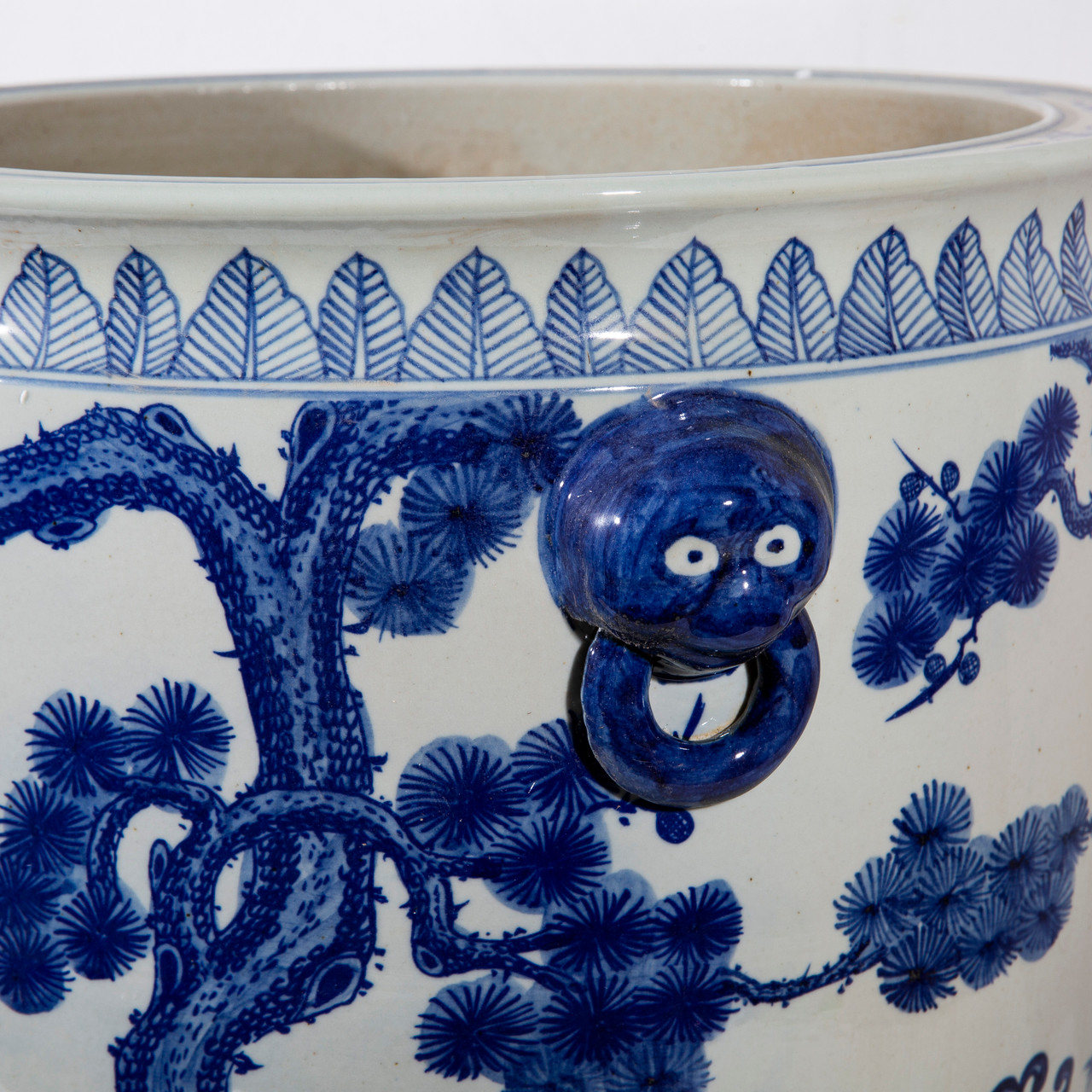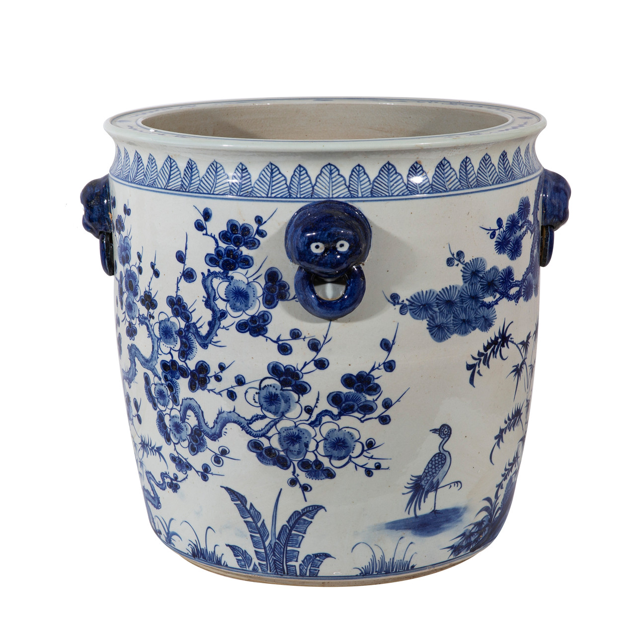 Blue And White Porcelain Pine And Plum Planter Lion Handle