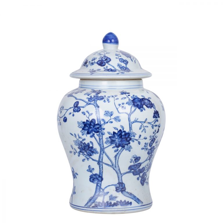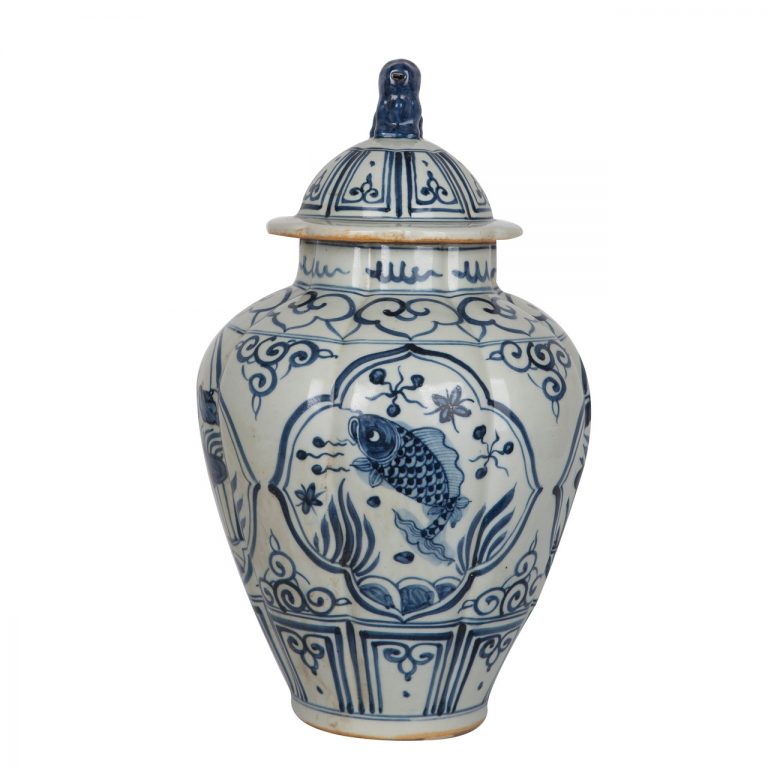 Blue And White Village Fish Lidded Jar Foo Dog Handles