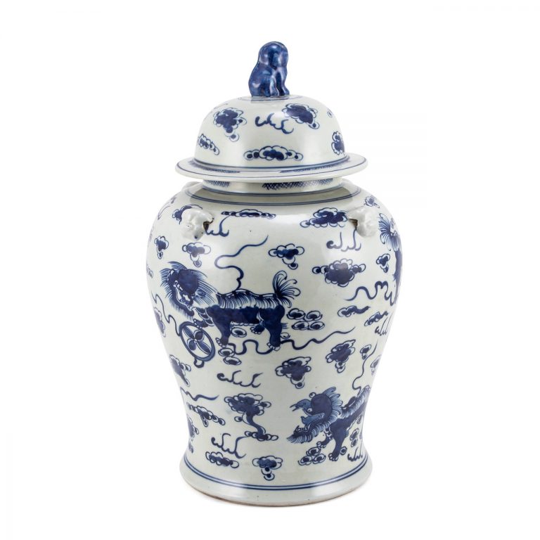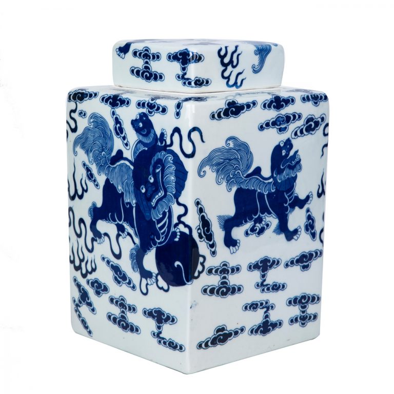 Blue And White Foo Dog Square Porcelain Tea Jar
