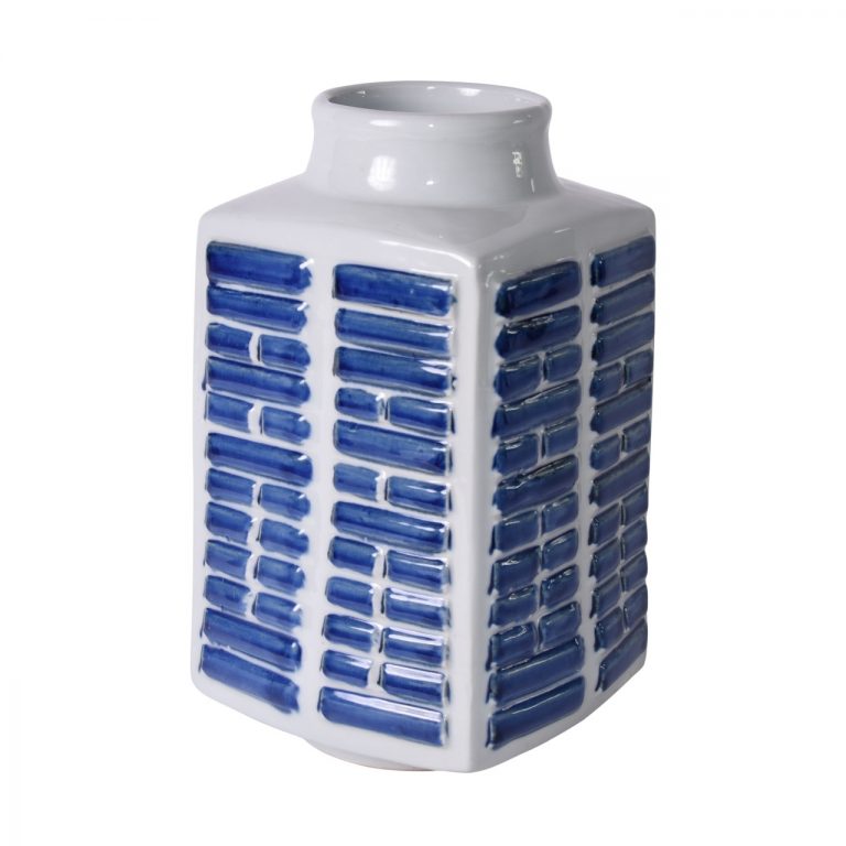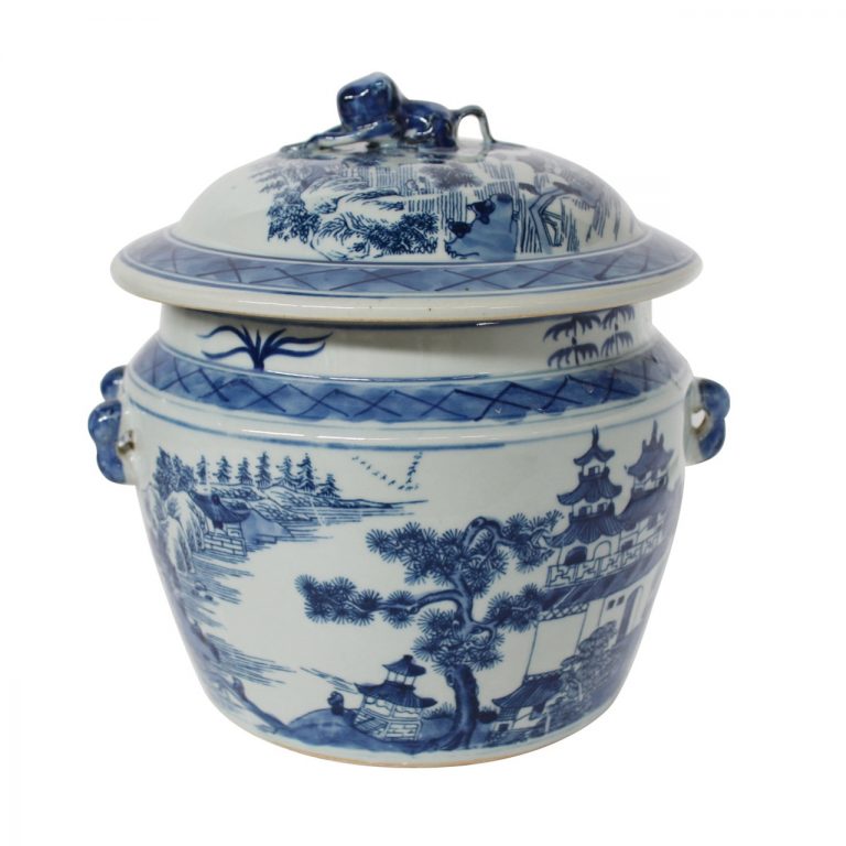 Blue And White Porcelain Temple Jar Landscape Greek Key Trim