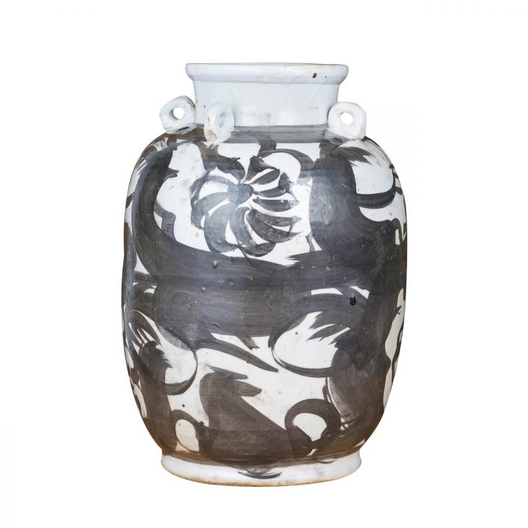 Black Four Loop Handle Jar Twisted Flower Motif
