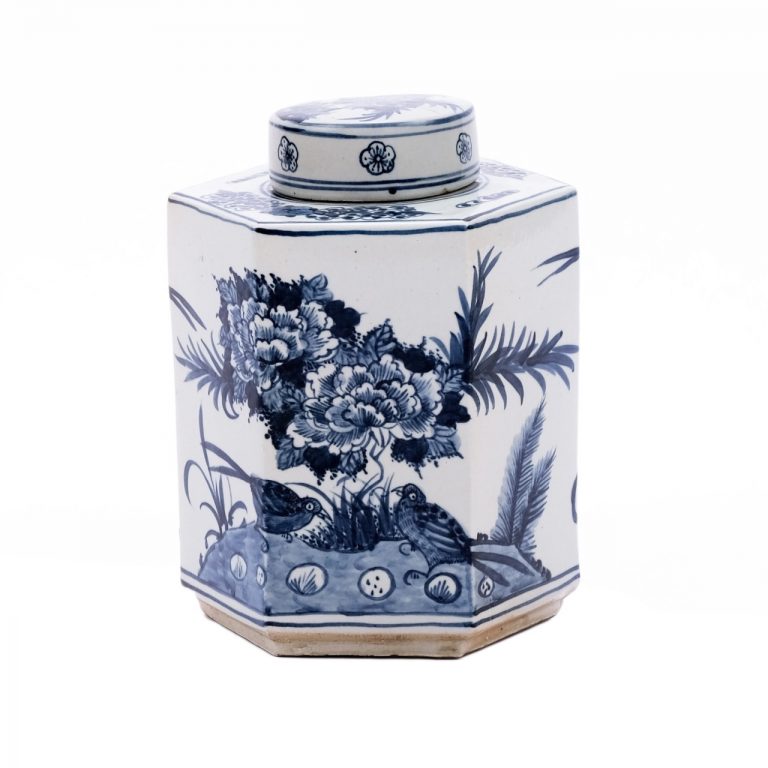 Blue & White Hexagonal Flower Bird Tea Jar