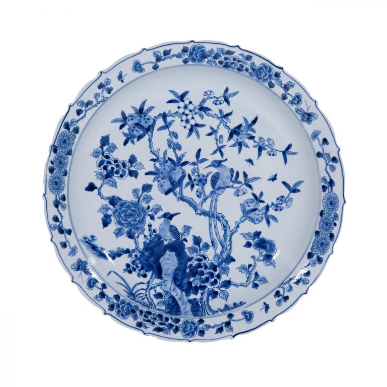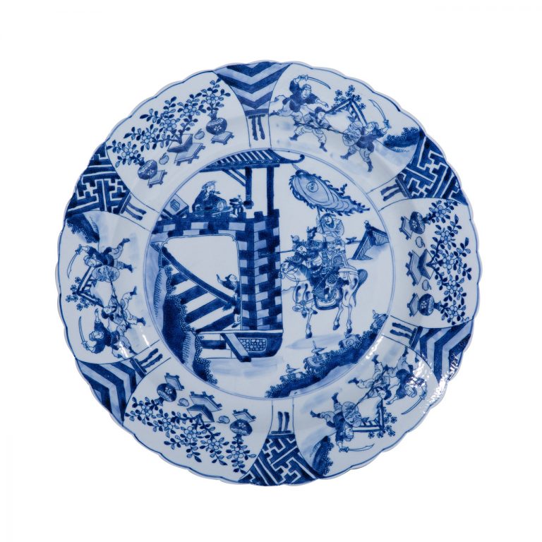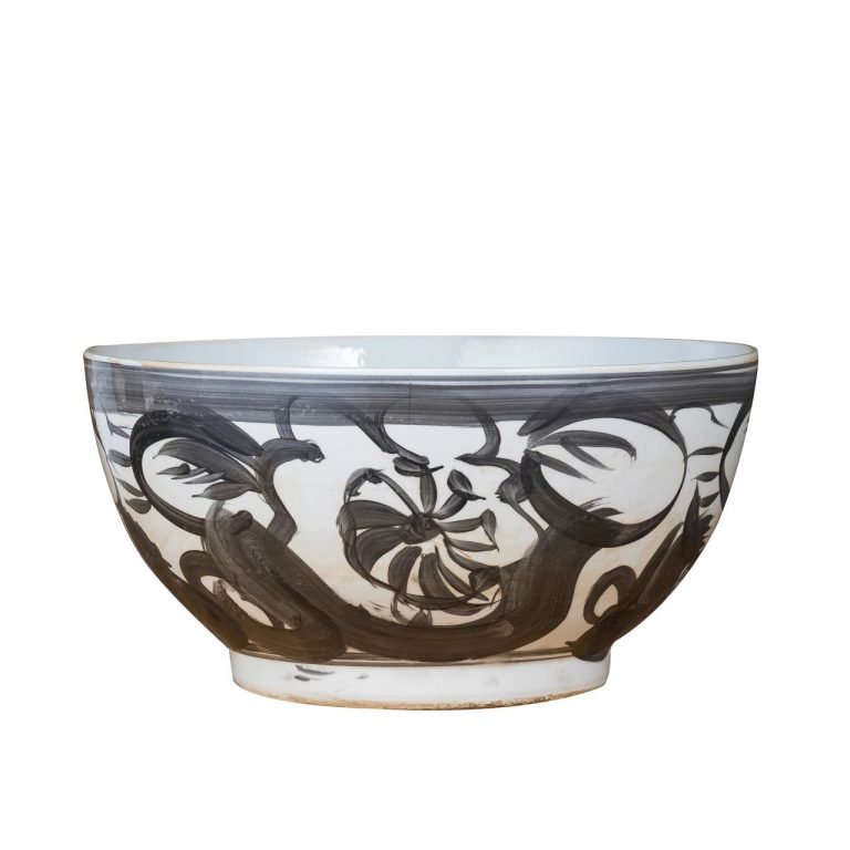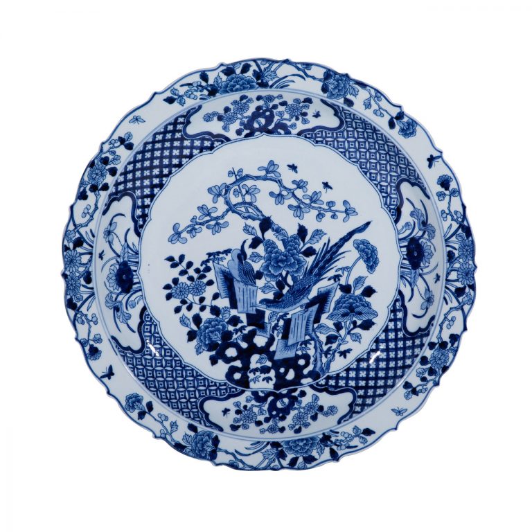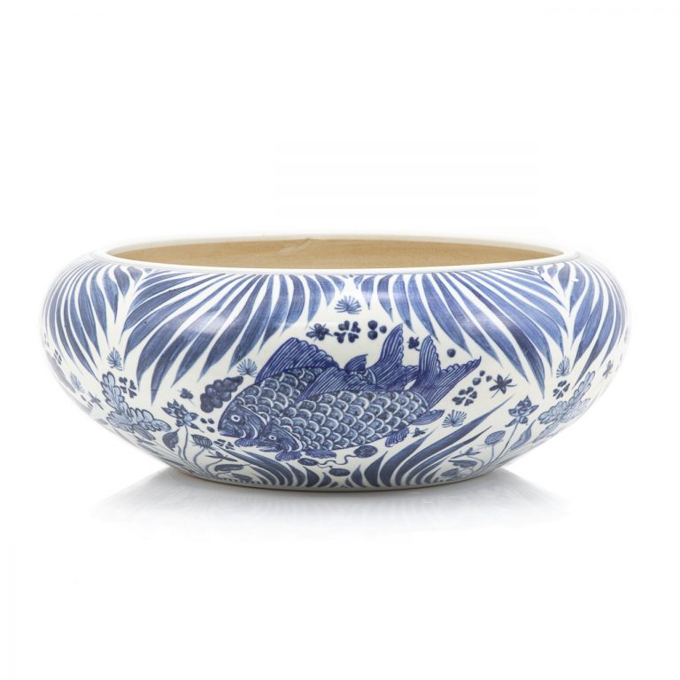 Blue And White Fish Lotus Bowl With Greek Key Trim