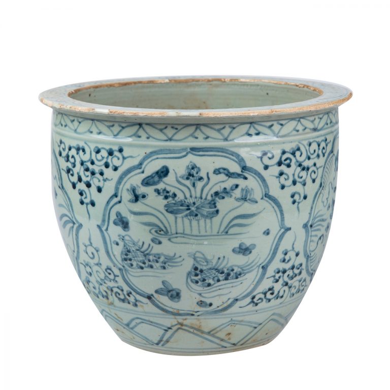 Blue And White Basin Planter Flower Bird Motif